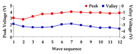 The piezoelectric sensor was placed on the skin above the radial artery and measured for 10 sec to obtain the continuous pressure waveform. Figure 7a shows the continuous PPW signals obtained from the analog circuit. In order to detect the exact locations of the peak and valley of PPW signals, post-processing was performed to produce distinguishable feature points of SBP and DBP, as shown in Figure 7b. Figure 8 shows that the peak and valley values were extracted from the continuous PPW post-processing signals by the threshold method. Figure 9a indicates that the voltage change within adjacent PPWs was calculated, according to Equations (8) and (9). The pressure change within adjacent PPWs was obtained by conversion of pressure sensitivity (2 mV/mmHg) and circuit amplification gain of 989, according to Equation (11). Therefore, the pressure change between adjacent beats can be calculated, as shown in Figure 9b. The measurement strategy uses the sum of the initial blood pressure by an oscillometric method and pressure change by a piezoelectric sensor to achieve the beat-to-beat SBP and DBP monitoring, according to Equation (1). The initial SBP and DBP measured by the cuff-method were respectively 109 mmHg and 61 mmHg. Figure 10 demonstrates the beat-to-beat SBP and DBP monitoring.