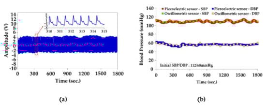 In order to perform accuracy evaluation compared to the oscillometric method, the left and right hands of 30 subjects with the individual sensors were synchronously measured for 30 min. The piezoelectric sensor was placed on the left hand to measure the continuously beat-to-beat pressure change for 30 min. The oscillometric sensor was measured on the right hand at a regular interval of 1 min for 30 measurements in 30 min (Figure 11). The performance of our system was evaluated by recording the MAE and standard deviation (SD) within two methods, according to Equations (12) and (13).