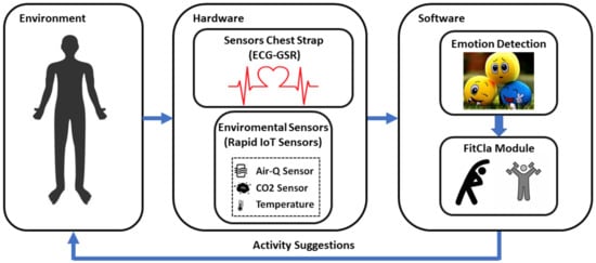 - Hardware: This group is composed of sensors for acquiring the different physiological signals, and a set of environmental sensors. These sensors can be used to perceive the evolution of the person to the exercise sequence. In fact, these sensors are grouped in two different artefacts: the Sensors Chest Strap, formed by a set of sensors that will go in the user chest, and they even could be linked to a slim-fit exercise t-shirt; and the Environmental Sensors formed by a set of sensors that can collect environmental information. Regarding the Sensors Chest Strap, it allows the acquisition of physiological signals such as electrocardiography, photoplethysmography and the calculation of the cardiac pulse. This information will, then, be used to perform a recognition of the individual’s emotional state [19,20]. The Environmental Sensors allows the system to determine if the environmental signs are optimal for performing the exercises. They measure conditions such as temperature levels, humidity, CO2 and air quality among others, as high levels of these environmental factors can cause harmful effects when exercising [21,22,23].
