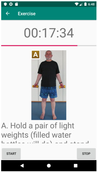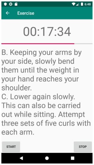 Apart from a scheduler (to add new exercises to the user’s daily life), based on the iGenda [27], FitCLA is composed by two more features: visual interfaces and learning models. Currently, these two methods are under a through validation process as both can greatly impact the user’s adoption rate and operational procedures. Preliminary visual interfaces can be observed in Figure 4 and Figure 5. These two interfaces show how users (in this case, the care-receivers) can visualise an exercise and activate the timer and guides that help them during the exercise performance. This helps the emotion recognition module and exercise identification, as the users signal when they have started to perform the exercise, which serves to coordinate the sensors log. The caregivers have also a dedicated web portal where they can manage the care-receivers information, exercise suggestion and overall configuration. Any changes in this portal (e.g., scheduling times) are reflected immediately on the mobile application. Furthermore, any alarms are directly shown to the caregiver. In ME3CA, the information is displayed both in the bracelet screen as well as on the mobile phone. A short text is showed along with a start/stop button so the user is able to signal when the exercise has started and stopped accordingly.