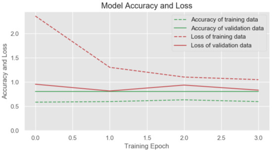 From the training process of our network, we extracted the parameters of prediction and loss. These were obtained from the training and validation data and are shown in Figure 7. The red dotted line shows us the loss in the data in the training phase, whereas the continuous line of the same colour indicates the loss in the validation data. It can be observed that our loss in the training phase is greater than in the validation phase. This allows us to determine that there is no overtraining. As the loss in the validation phase is lower, we can determine that our model classifies correctly and since there is no overtraining, we conclude that the model has been adapted to the training data.