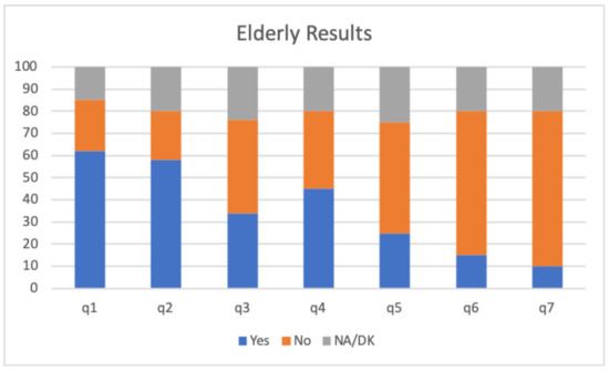The results obtained from this study are presented in Figure 8 and Figure 9. Specifically, Figure 8 shows the results taking into account the average of the responses of the elderly to the questionnaire. As it can be seen, Q1, Q2 and Q3 are related with the adequacy of the activity with respect to the care-receiver, which showed a fairly acceptable result. In general, the recommended activities have been to the liking of people and they have felt good after performing the activity. Regarding Q4–Q7 (related to the emotional state after the activity), it is observed that a significant percentage (45%) have felt excited after performing the activity recommended by the system and that the percentages of the rest of the answers are quite low, which is positive.