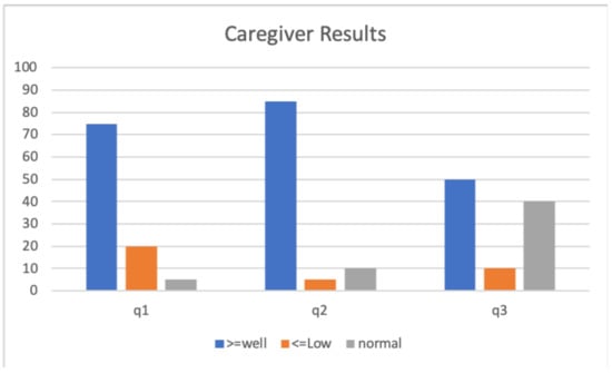 Concerning the results obtained in Figure 9, we can observe that the caregivers consider that the activities recommended by the system are appropriate (see Q2). However, it is observed that the conditions of the environment and the time in which the activities were done are not important. In particular, confirmed by Q3 where the percentage of undecideds is very high (40%). Finally, the caregiver positively perceives the patient’s performance of the activity, considering the activity to be adequate for the patient (see Q1). However, caregiver results should be taken very cautiously given the small number of responses, although the results obtained are quite promising.