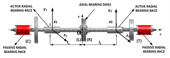 In Figure 1, the elements marked as (C) and (T) are mass equivalents of the TS-21 compressor and turbine. The symbol O denotes the center of mass, which is located 178 mm (l1) from the “left” active radial bearing #1 and 191 mm (l2) from the “right” active radial bearing #2.