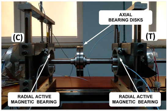 Figure 2 presents the laboratory stand with the magnetic suspension system. The radial active magnetic bearings are set in the universal grips, and the axial magnetic bearing is dismounted. Air gaps in the radial and axial magnetic bearings are equal to 0.4 mm and 0.5 mm, respectively. Thus, the operating point current for each bearing is 5, and the maximum current for each bearing is 10 A, whereas axial one has 80 coils. Viscoelastic parameters of active magnetic bearings depend on control law parameters as well as current stiffness coefficient and displacement stiffness coefficient, being 3.74 × 105 N/m and 1168 Ns/m, respectively. The axial bearing was designed to carry axial loads of 1.5 kN, because of the engine thrust force, whereas radial bearing was designed to maintain a 100 N load. Mass equivalents of compressor and turbine are marked as (C) and (T), as shown in Figure 1. Eddy current sensors are located in the electromagnet covers. Signals from these sensors provide information about rotor position for the closed-loop control system and could be useful for the diagnosis system as well.