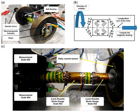The rotary system with an active magnetic bearing, as shown in Figure 3, was investigated to obtain its dynamic behavior with the developed measuring system. This system enabled the continuous measurement of the magnetic bearing operational parameters, such as rotating shaft strains, rotor displacements, and vibrations. During studies, strain measurements with full bridge and quarter bridge were registered by a wireless data acquisition (DAQ) system. The sensors were located in two cross-sections of the magnetically suspended shaft, that is, one in the middle (Node 955) and the second near the magnetic bearing (Node 954). Two different bridge configurations for strain gauge were utilized to measure the local uniaxial strain with a quarter bridge and quasi-vibrations from the rotational motion with a full bridge. In a classical bearing system, a full-bridge configuration allows the measurement of torsion strain, but in the magnetic bearing system, this component is absent.