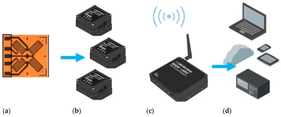 Diagram of the measurement system [13]: (a) strain gauge in a full-bridge configuration as a sensor, (b) wireless nodes, (c) gateway, (d) software.
