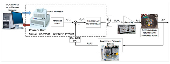 The laboratory stand of the magnetic suspension system was also equipped with contactless position sensors to measure the rotor displacement in the air gap. These sensors were a part of the control system, as shown in Figure 5. The laboratory stand consisted of a control unit, proportional–integral–derivative PID controller, amplifier, electromechanical actuator with the supported rotor, and contactless eddy current sensors.