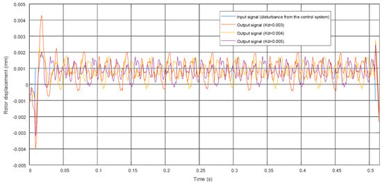 The time characteristics of the control systems with the proportional-derivative PD controller are presented in Figure 6. The proportional parameter of the PID controller was marked as Kp and was constant during the presented measurement, whereas the derivative parameter of the PID controller was marked as Kd. The reference signal had the form of a rectangular signal acting on the Ox axis with amplitude and frequency equal to 0.01 V and 1 Hz, respectively. Later in the paper, this reference signal is called disturbance from the control system acting on the Ox or Oy axes. Other signals depicted in the figure present outputs from the control systems with the PD controller in the form of rotor displacements. In this figure, the vibration amplitude of the rotor can be observed. As the derivative parameter of controller Kd increases, the vibration amplitude decreases. The system behaves like an oscillator with one degree of freedom and its transfer function reads as follows: