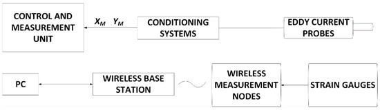 In conclusion, a measurement system for active magnetic bearings consists of strain gauges and eddy current sensors to measure strains and rotor displacements, respectively. The flowchart of the overall measurement process is presented in Figure 7. At the laboratory stage of the study, comparison results were obtained from strain gauges placed on the rotor surface. The analysis of research results allows the development of the monitoring and diagnosis system for a bearing system for a UAV engine rotor, equipped with passive and active magnetic bearings.