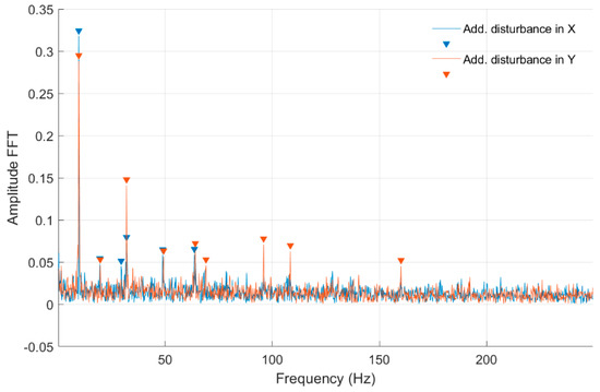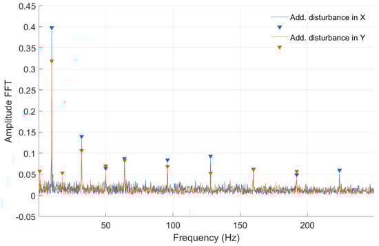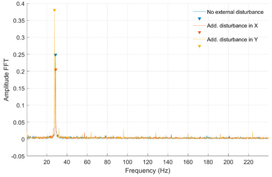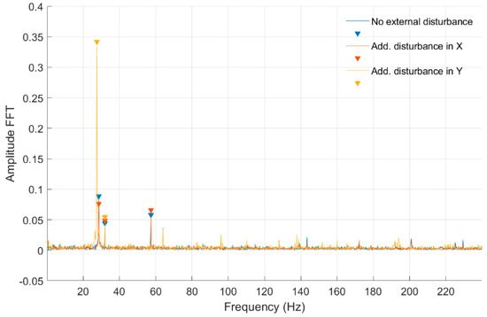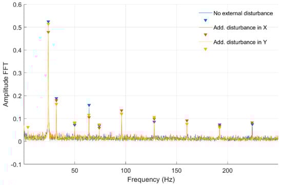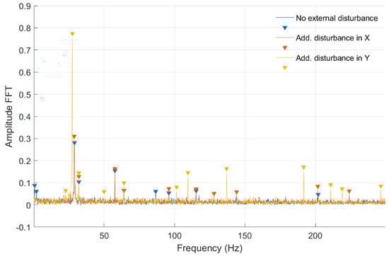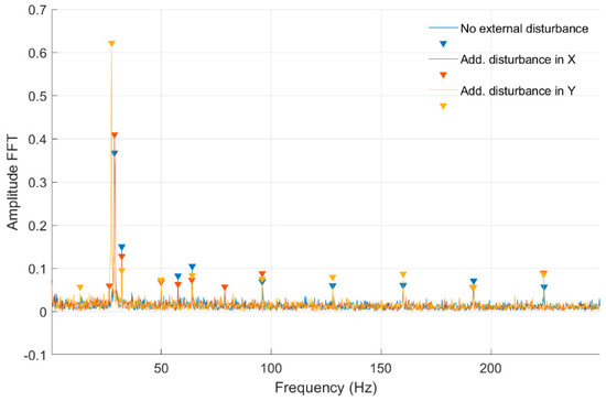 In Figure 8 and Figure 9, fast Fourier transform (FFT) characteristics of the rotating shaft strain measured for a constant motor rotary speed equal to 25 rev/s for a quarter-bridge configuration at both shaft cross-sections, Nodes 954 and 955, are presented, respectively. These characteristics were registered without and with disturbance from the control system. Measurement with no disturbance is marked by a blue line, and measurements with disturbance added to the control signal in the Ox and Oy axes are indicated by red and orange lines, respectively. In Table 1, the list of significant values from the characteristics shown in Figure 8 and Figure 9 is presented. Cells with peaks from the sampling frequency are marked in blue.