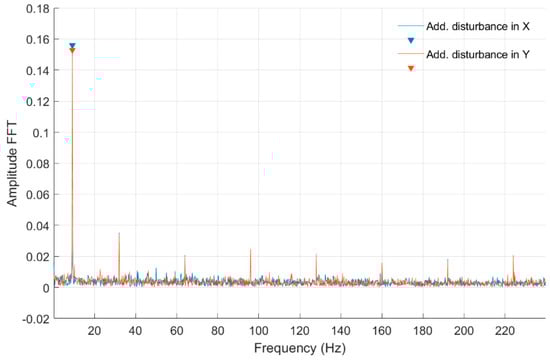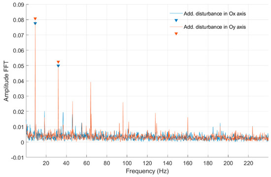 Strain measurements were conducted for both cross-sections simultaneously for constant parameters of the control system and disturbance signals acting on the Ox and Oy axes. These disturbances were generated by the control system. Strain time-domain signals were acquired using a 512 Hz sampling frequency, for approximately 20 seconds of stable rotational speed. For each rotational speed, three measuring series were made with no disturbance, disturbances added in the Ox axis, and disturbances added in the Oy axis. Fast Fourier transform (FFT) analysis was performed for time-domain signals and the frequency characteristics are presented below.