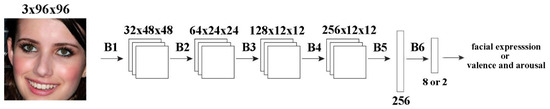 In recent years, deep learning, especially convolutional neural networks (CNNs), has achieved impressive performance for various computer vision and pattern recognition tasks [26,27,28,29]. There are also enormous methods using CNNs in facial expression recognition in recent years [30,31,32]. In addition, there also have been some researches on the dimensional model since the development of deep learning [33,34]. Within the dimensional model, a particular facial affect can be mapped on an arousal/valence value, which describes the range of arousal (high to low) and valence (pleasure to displeasure). In these studies, deep learning-based architectures are especially efficient for facial affective computing and can achieve high performance. The main reason for the success of CNNs is that CNNs are able to overcome the limitations of the handcrafted features in the wild settings by directly extracting highly discriminative features of the raw data.