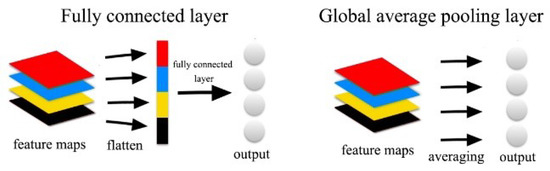 After four convolutional blocks, we use a Global Average Pooling (GAP) layer instead of fully connected layers to extract 256-dimensional feature vectors. The purpose of using GAP is to reduce parameters and computation complexity. GAP was proposed by Lin et al. [39]. In [39], which was used to takes the average of each feature map replacing the traditional fully connected layers on the CNN. As shown in Figure 2, the main difference between those two layers is that the output of a flatten layer has to be fed into a fully connected layer to get features we need, but the output of the global average pooling layer has already the desired dimension. The fully connected layer can add a large number of parameters and then increase the complexity of the model and the degree of overfitting. Therefore, the main advantage of GAP over the fully connected layers is that there is no need for parameter optimization in the global average pooling, which greatly reduces parameters and computation complexity.