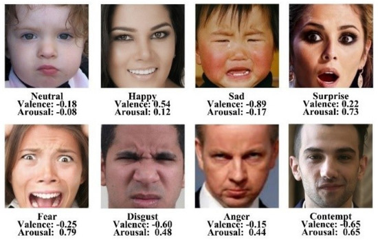 Examples of the eight categories of facial expressions (Neutral, Happy, Sad, Surprise, Disgust, Fear, Anger and Contempt) and their values of valence and arousal from the AffectNet [33].