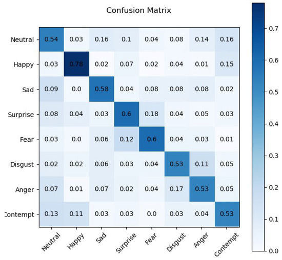 Facial expression classification confusion matrix of the proposed network architecture on AffectNet validation set.