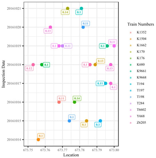 Figure 2 presents the measured values and mileages of the lateral vibration from cabin-mounted track quality instruments collected between 14 October 2016 and 21 October 2016 in the up direction of Lanxin Railway. All these measurements were caused by the same track defect, which is classified as defect type alignment and defect rank B. The defect was located between sleeper No. 54 and sleeper No. 63 of turnout No. 4 at Shangqinghe Station. Note that “up direction” means the train is bound for Beijing, the center of the Chinese railway network. The horizontal axis of the figure represents the location along the railway line (in kilometers), and the vertical axis represents the date of inspection of the track vibration defects. The differently colored dots represent different train numbers, and the numbers in the square label boxes represent the measured values of lateral vibration.