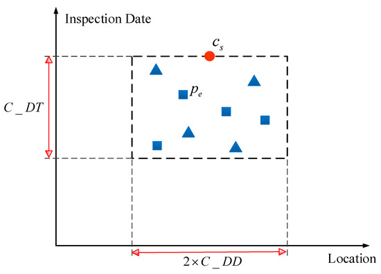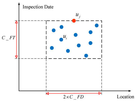 The inspection frequency of the track quality instruments is high, and there are substantial measurement biases in vibration data from these instruments. As a result, the same track geometry defect will be detected repeatedly by track quality instruments before the defect is repaired. The corresponding measurement points will fall within a consistent region. The algorithm schema of the BC-IVAM sub-model is shown in Figure 3. The horizontal axis represents the location of track vibration defects along the railway line, and the vertical axis represents the inspection date for track vibration defects. The points represent different track vibration defects detected at different dates. The length of the rectangular area in Figure 3 is , and the width of the rectangular area is . If track vibration defect points fall within this rectangular area, these defect points are assumed to result from the same track geometry defect. If a track vibration defect point, , satisfies Equations (3) and (4) the point falls within the rectangular area. In Figure 3, for example, the points and correspond to the same track geometry defect.