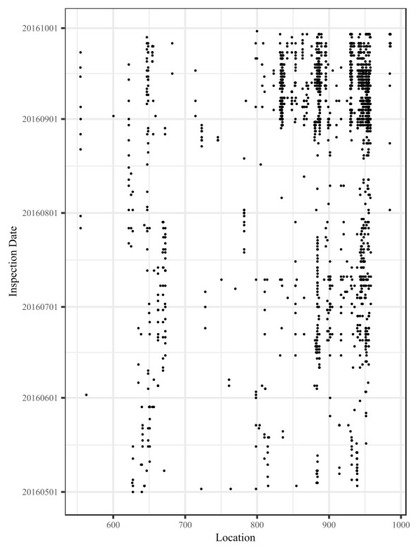 The distribution map for these track vibration defect data is shown in Figure 6. The horizontal axis represents the location along the railway line (in kilometers), and the vertical axis represents the inspection date of the track vibration defects. The points represent different track vibration defect points obtained by using track quality instruments. Because the inspection frequency for track quality instruments is several times per day and because of the measurement bias, the same track geometry defect will correspond to multiple vibration defect points before the track geometry defect is repaired. Although the track vibration defect points in Figure 6 are intensively and continuously distributed in the time dimension, the actual true positive vibration defect points could be fewer.