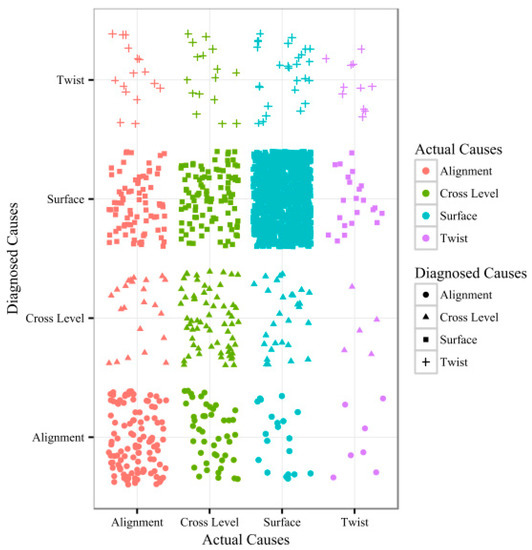 A scatter plot of the diagnosed and actual causes of track vibration defects is shown in Figure 8. The horizontal axis represents the actual causes and the vertical axis represents the diagnosed causes. Points in different colors represent the defect points that have different actual causes. Points in different shapes represent the defect points that have different diagnosed causes.