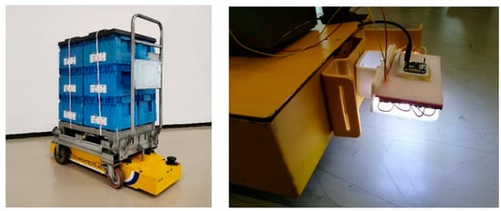 On the left, an autonomous omnidirectional vehicle being experimented in an industrial setting for moving carts between different zones of a factory; on the right, a close view to the vision-based system used to aid in robot localization.