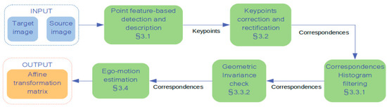 Processing pipeline employed in the methodology, starting from pair of successive images and providing the affine transformation matrix of the detected motion.