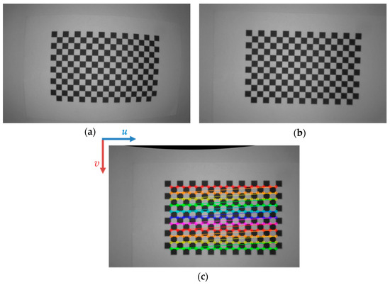 As effect of this pose compensation by means of the estimated rotation matrix, the sample image reported in Figure 3b is remapped as in Figure 3c. This leads the chessboard corners to be perfectly aligned with the horizontal u- and vertical v- directions of the image under analysis.