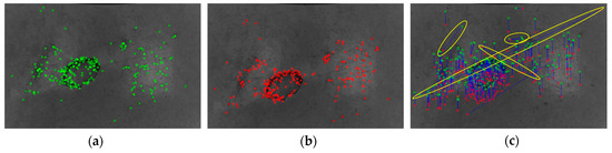 Detected keypoints related to the (a) target image and (b) source image. (c) Corresponding keypoints related to two consecutive frames acquired during the motion. Some incorrect matches to be removed are highlighted by yellow ellipses.
