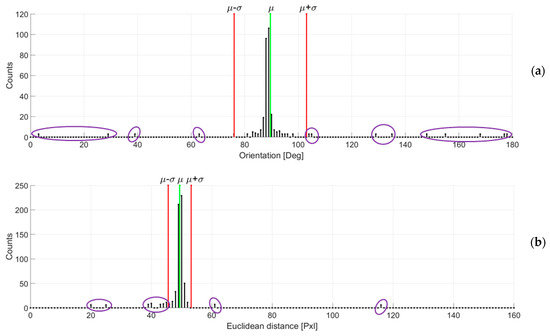 Secondly, a similar statistical analysis is performed for the remaining inlier correspondences from previous step by considering their Euclidean distance. In this way, too long or too short segments (or joining lines) are efficiently removed because they do not meet the expected distance criterion. The Euclidean distances are cumulated into a histogram by considering 160 bins. The number of bins has been set empirically, taking into consideration the image size and the need for a feature to be visible for at least two consecutive frames. Figure 5b shows the Euclidean distance histogram, whose statistical analysis aids to filter out the incorrect matches (once more in purple). A gaussian distribution is considered for analyzing both histograms.