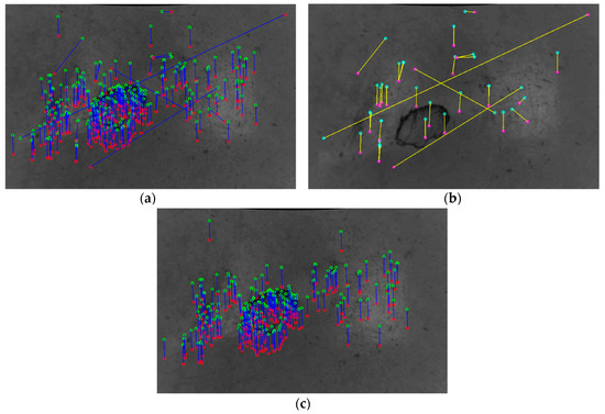 At this stage, all the correspondences that do not meet the statistical requirements of both distance and orientation, i.e. the ones having values out of the range where and stand respectively for the average value and the standard deviation related to the considered distribution, are removed from the following processing. Figure 6a shows the correspondences that undergo the statistical analysis and Figure 6b reports the incorrect matchings that are removed. In Figure 6c the remaining correspondences are shown, that proceed in the next step of the analysis.
