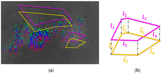 (a) Some polylines having five sides are built by using the target and the source keypoints. (b) Enlargement of polylines in relation with each other, whose edge lengths have to be evaluated for establishing the goodness and robustness of keypoints in terms of image locations.