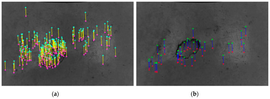 In case all the edge lengths of two corresponding polylines is almost similar because of the pose invariant assumption, the related keypoints are labeled as good points. Conversely, all the keypoints considered in the closed line loop are discarded from the final point sets if just one of the considered distances fails the test according to Equation (2). The ratio between two corresponding sides is always in the range [0,1]. Figure 8 reports the correspondences labeled as outliers by means of the proposed geometric invariance checks and the remaining robust correspondences.