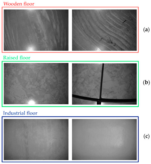 In Figure 10, some images related to the considered floors are reported. As one can notice, the industrial floor seems to be the most challenging for the proposed vision approach as it is highly reflective and presents a low texture level in comparison with other two floors. The raised floor is averagely reflective but contains more patches and dark edges that outline adjacent floor panels. Finally, the wooden floor is low reflective but highly textured.