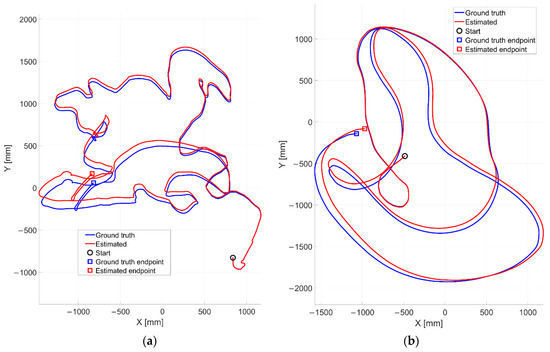 Estimated positions (in red) qualitatively compared with the ground truth ones (in blue) for (a) the experiment I and (b) the experiment II, both run at our robotics lab.
