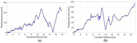 The final positioning errors are found equal to 109.8 mm and 114.7 mm for the experiment I and experiment II, respectively. It can be noted that in some cases the positioning errors during the motion are higher than the final positioning error (e.g. in Figure 12a). This is due to how the error builds up over time. Since the error is not-systematic and can be positive or negative along the X- and Y- directions according to the motion type, the signal positioning error is not a strictly increasing or decreasing monotonic function.