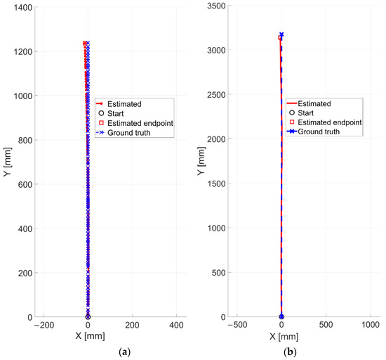 Finally, a continuous acquisition is performed for the experiment VI in order to evaluate the capability of method in estimating straight displacements. The cart has been moved at an average speed of 0.12 m/s by still following the linear stage. An overall distance of 3.18 m has been traveled. The result is reported in Figure 17b.