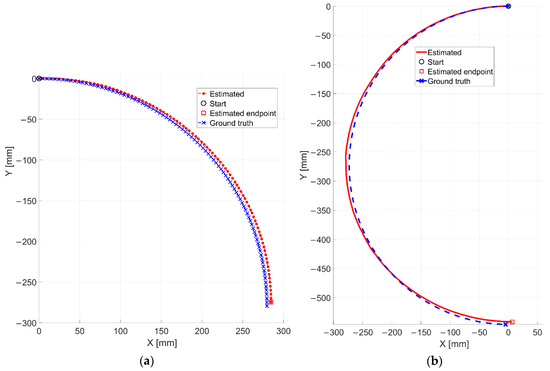Finally, a continuous acquisition has been considered for the experiment VIII, where a 180 degrees rotation has been performed (see Figure 18b). The average angular speed is about 19.96 Deg/s. As for the previous test, the trajectories look qualitatively very comparable. For the sake of completeness, the final positioning error is also reported, which is found equal to 7.07 mm. The traveled distance is 0.87 m.