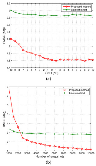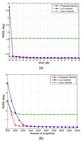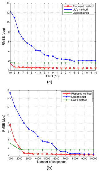 In the second scenario, we further appraise the performance of the algorithm in this submission under stronger mutual coupling. More precisely, we consider the case of with . The corresponding RMSEs versus SNR and snapshot size are illustrated in Figure 2. It can be seen that the proposed approach performs the best over the entire range of SNR values and the moderate numbers of snapshots. Nevertheless, a performance degradation appears for less than 2000 snapshots mainly because Equation (12) is guaranteed to hold under strong coupling effects only for sufficiently large samples. Contrary to the performance in the first scenario, Liu’s method is strictly inferior to Liao’s method for all SNRs. As analyzed in Section 4.1, the size of the middle sub-array adopted by Liu’s method is , and the size of the noise subspace is , which is much smaller than the noise subspace of the proposed method and the signal subspace of Liao’s method. Due to the fact that a consistent estimate of a small subspace requires a sufficiently large number of snapshots, Liu’s method has relatively large errors for a moderate number of snapshots, even at high SNRs.