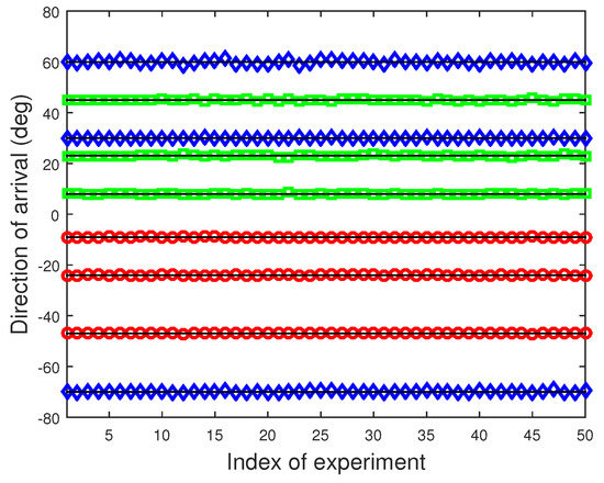 Then, we verify the proposed scheme for the more challenging scenario where coherency between signals and mutual coupling between sensors coexist. Consider that three groups of coherent signals, three paths per group, from , , and impinging on a ten-element coupled ULA with and . The fading amplitudes of the coherent signals were , , and , while the fading phases were , , and , respectively. The number of times of FBSS is , and the SNR and number of snapshots are fixed at 15 dB and 5000. Figure 4 illustrates the DOA estimates from 50 independent trials by the developed method in such a harsh case. The solid lines mark the true DOAs. It can be seen that each DOA is correctly determined, and our solution performs satisfactorily.