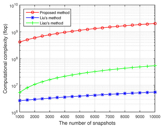 In the last experiment, the computational complexity of the three algorithms versus the number of snapshots is examined. The searching step-size in the MUSIC-like methods is set as , and the number of snapshots varies from 1000 to . Suppose that the number of sensors in the ULA , the coupling length , and the number of independent signals . It can be observed from Figure 5 that our method costs the highest computation, followed by Liao’s method, while Liu’s method is most computationally efficient, which supports the analysis in Section 4.2.