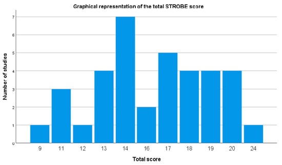 The STROBE checklist scores of the included studies are summarized in Table 5 and Figure 2, which describes the graphical representation of the total STROBE score. The mean score of included studies was 15.92 points, with a standard deviation of 3.33. The minimum score was 9 points and the maximum score was 24 points. Most of studies (>70%) obtained a positive rating in items regarding the title and abstract (Table 5, columns 1a and 1b), introduction (Table 5, column 2), study design (Table 5, column 4), definition of the variables of interest (Table 5, column 7), sources (Table 5, column 8) and quantification Table 5, column (11), description of statistical methods (Table 5, column 12a), data on sample characteristics (Table 5, column 14a), reporting of outcome measures (Table 5, column 15) and statistical estimates Table 5, column (16), and summary of key results with reference to study objectives (Table 5, column 18).