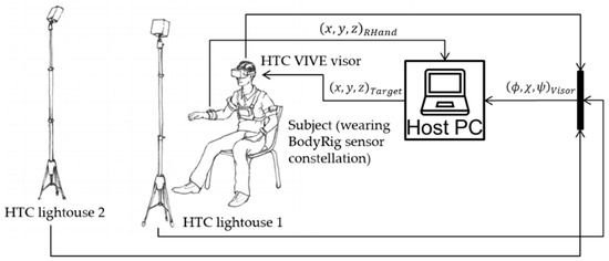 The HTC Vive VR visor (see Reference [20]) was used to provide the subjects with visual feedback in virtual reality. The visor uses two light sources to determine its own orientation and position, although in this experiment only the orientation of the visor was needed. The precision of the Vive system, measured using a “tracker,” is sub-millimetric in a static configuration [21,22]. The position of the avatar’s head was determined using forward kinematics based on the data coming in from the BodyRig system together with the orientation of the head as measured by the visor itself. The BodyRig monitored the orientation of trunk, both humeri and both forearms. Therefore, considering the measurement of the user’s head’s orientation with the visor, a total of 6 body segments were monitored. Figure 1 shows a diagram with the fundamental elements of the setup.