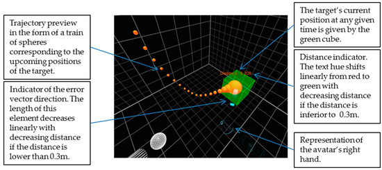 In VR, the subjects were provided with a 3D representation of their avatar, the current position of the target and a train of spheres marking the upcoming positions of the target along its trajectory. Additionally, the subjects were provided with a textual indicator of the current distance of the target from the avatar’s right hand. Furthermore, a cylinder was made visible in VR to the users, which from the center of the target pointed at the right hand of the avatar, providing a useful indication of the direction along which it was necessary to correct for the current error at each given time. Figure 2 depicts a more detailed description of each relevant element present in the VR simulation.