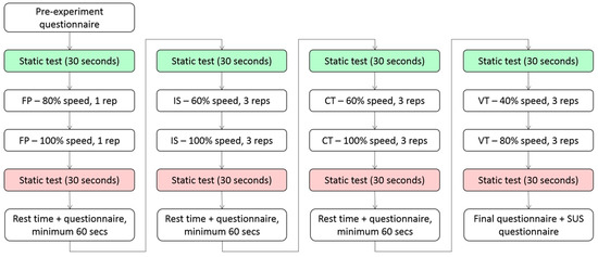 Flowchart illustrating the experiment’s execution. The green and red color represent the static tests executed after the resting phases and after completion of a task series, respectively.