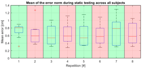 Boxplot over all subjects of the mean error norm measured over each static testing session.