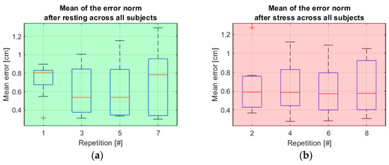 Boxplots of the error during static tests specifically after resting phases and after completion of one task series. (a) Boxplot of the mean error in static tests executed after a resting phase; (b) Boxplot of the mean error in static tests executed after completion of a task series, before a resting phase.