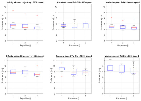 Boxplots of the scalar error over the repetitions for each target profile and speed.