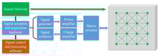 An ultrasonic guided wave active monitoring system is commonly composed of a sensor network; signal actuation and acquisition hardware; and signal control and processing software [4]. The electronic hardware system mainly includes a signal generator, signal collector, power amplifier, charge amplifier and a matrix switcher for controlling the switching of actuation and acquisition sensors, as shown in Figure 1. The signal generator generates a 5-cycle Hanning windowed toneburst. The actuation signal is input into the matrix switcher when the power amplifier is amplified to the power suitable for the actuation of PZT. The matrix switcher switches the corresponding actuation sensor and the acquisition sensor, and sends the acquisition signal back to the charge amplifier, which is then amplified and collected by the signal collector. In said way, a cycle of signal actuation and acquisition is completed.