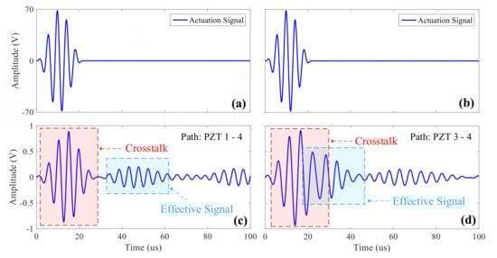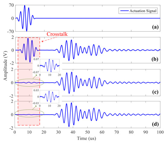 In the ultrasonic guided wave monitoring system, in order to reduce the number of sensors, the actuation and acquisition sensors basically share the same set and they are switched by a matrix switcher. Effective isolation can be achieved by a semiconductor switching device at low voltage, and crosstalk signals can be suppressed [6]. However, semiconductor devices have parasitic capacitance, and large leakage current can be produced by their substrates at higher voltage. However, the frequency of actuated wave is generally around 50–1000 kHz which is in a relatively high frequency range. Therefore, it is easy for it to pass through the isolation by the parasitic capacitance and produce induction signals in the collection channel, which is one of the sources of crosstalk signals. The strength of the induction signal increases with the increase of the actuation voltage, which is superimposed with acquired ultrasonic guided wave signals and amplified after passing through the charge amplifier, resulting in the distortion and even saturation of the ultrasonic guided wave signals. As displayed in Figure 2a,b, the actuation signals of sensors and (c) and (d) are the acquisition signals after being amplified by the charge amplifier. From Figure 2c, it can be clearly seen that at the beginning of the acquisition signal, the crosstalk signal with the same waveform of actuation signals appears, and the signal amplitude is very high. When the actuation and the acquisition sensors are very close to each other, especially when applied to the monitoring of hot-spot areas, ultrasonic guided wave signals would be detected by the acquisition sensor before the actuation period finishes, as shown in Figure 2d. The ultrasonic guided wave signal detected by the acquisition sensor is superimposed on the crosstalk signal on the acquisition channel, which distorts the signal and makes it impossible to obtain the true and effective signal, thereby affecting the accuracy of damage location.