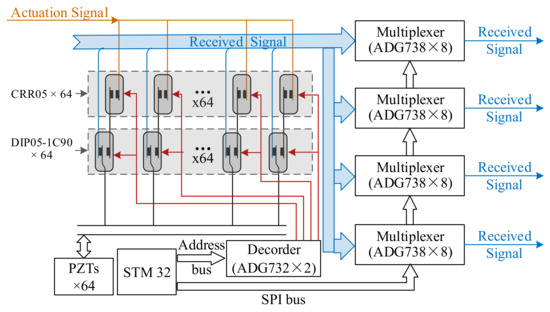- This design supports the input of an up to 64-channel sensor array and adopts the mode of single-actuation and four-simultaneous-reception. In this system, any sensor can be used as the actuation source and the other four as the reception source, which effectively improves the acquisition efficiency.
